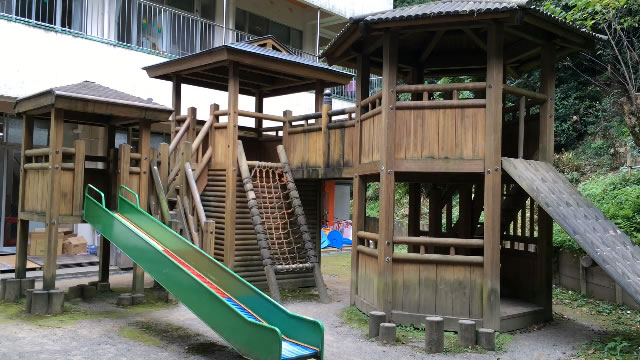 | 園舎概要 | 鉄筋コンクリート三階建 保育室8 ホール 屋上プール 給食室 他 |